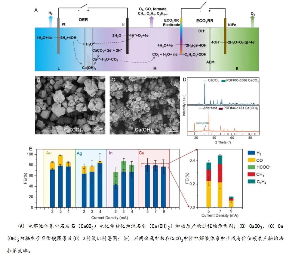 首先,本工作基于中性水分解反应体系对CaCO3进行处理转化。此过程利用中性水分解反应中析氧反应过程产生的氢离子(H+)与CaCO3反应生成钙离子(Ca2+)及二氧化碳,Ca2+与体系中生成的氢氧根(OH-)结合形成Ca(OH)2,可直接用于水泥生产。其次,通过切换施加电压,将体系中生成的二氧化碳原位转化成有价值的碳质产物,如一氧化碳、甲烷、烯烃等,反应产物可以通过调换催化剂实现调控。
