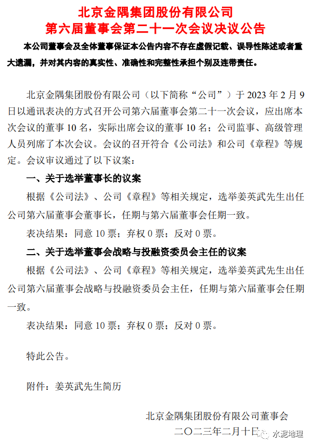 2023年2月9日下午,金隅集团召开领导干部大会,宣布北京市委、市政府关于金隅集团主要领导任职的决定:姜英武同志任北京金隅集团股份有限公司党委书记、董事长,不再担任总经理职务。