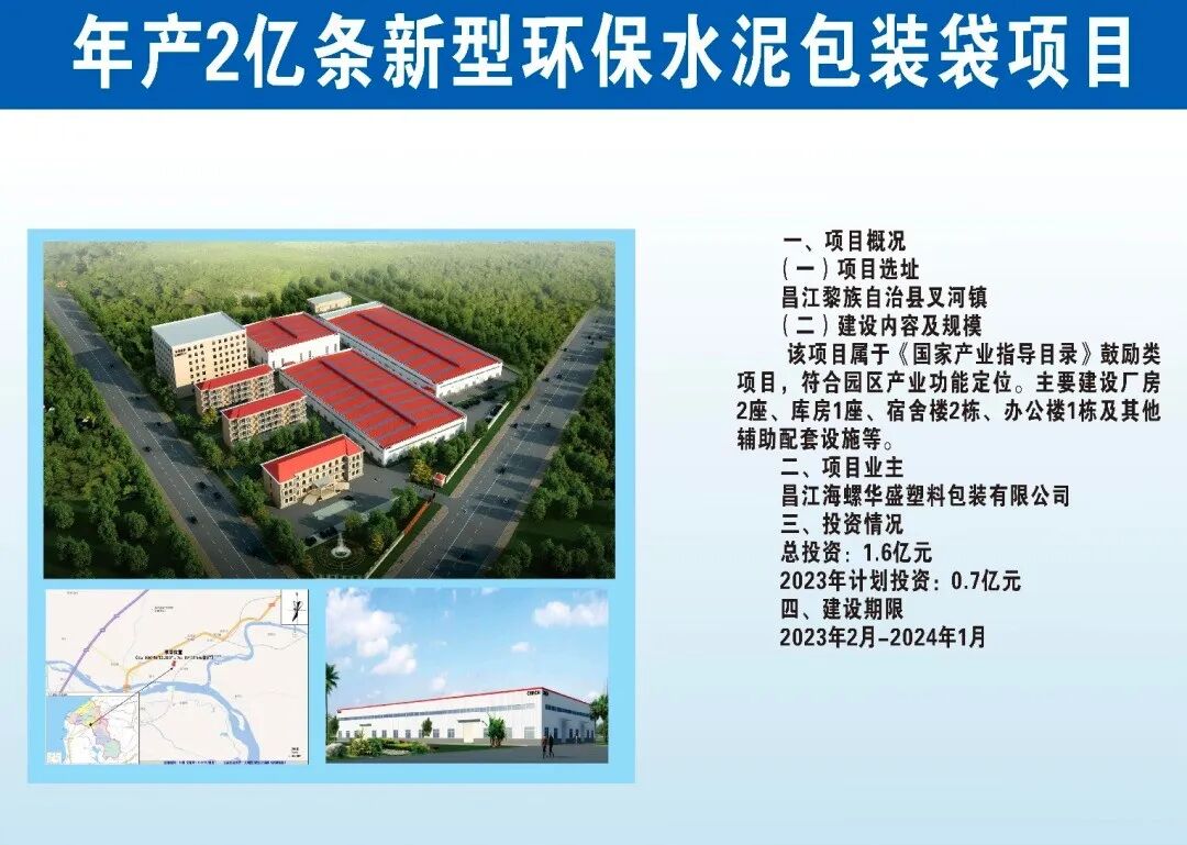 记者了解到,昌江共有9个项目参加海南自由贸易港建设项目2023年度第一批集中开工活动,其中社会投资项目4个,其中包括年产2亿条新型环保水泥包装袋生产线项目,项目业主为昌江海螺华盛塑料包装有限公司。