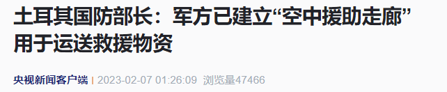 当地时间2月6日,土耳其国防部长阿卡尔表示,该国武装部队已经建立了一条“空中援助走廊”,用于向灾区运送医疗队、搜救队、车辆以及其他物资。