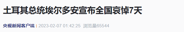 当地时间2月6日,土耳其南部发生强震并造成大量人员伤亡,土耳其总统埃尔多安当天宣布全国哀悼7天。