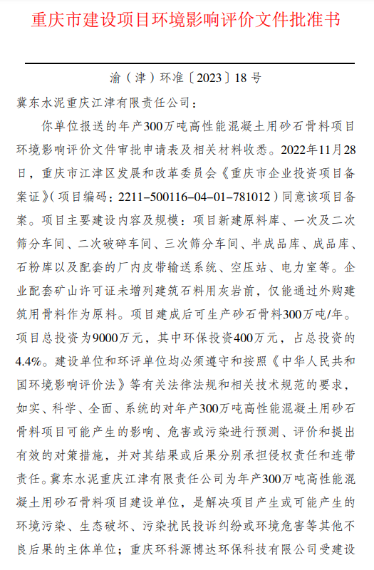 总投资为9000万元,金隅冀东300万吨/年砂石骨料项目即将开建