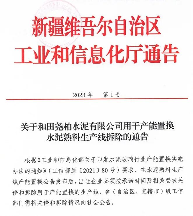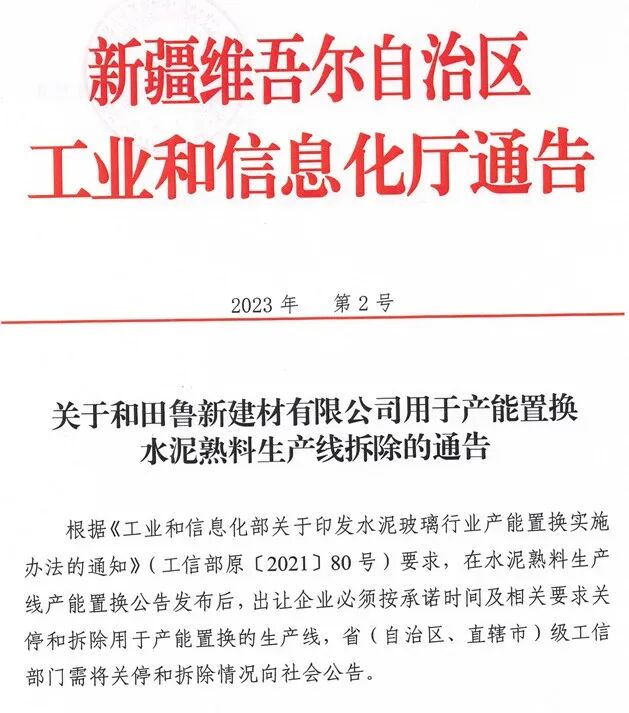 根据《工业和信息化部关于印发水泥玻璃行业产能置换实施办法的通知》(工信部原【2021】80号)要求,在水泥熟料生产线产能置换公告发布后,出让企业必须按承诺时间及相关要求关停和拆除用于产能置换的生产线,省(自治区、直辖市)级工信部门需将关停和拆除情况向社会公告。
