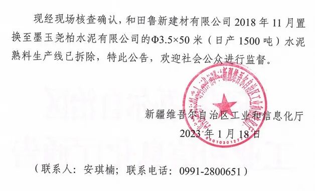 现经现场核查确认,和田尧柏水泥有限公司2018年11月置换至墨玉尧柏水泥有限公司的日产4500吨水泥熟料生产线已拆除,和田鲁新建材有限公司2018年11月置换至墨玉尧柏水泥有限公司的Φ3.5×50米(日产1500吨)水泥熟料生产线已拆除。