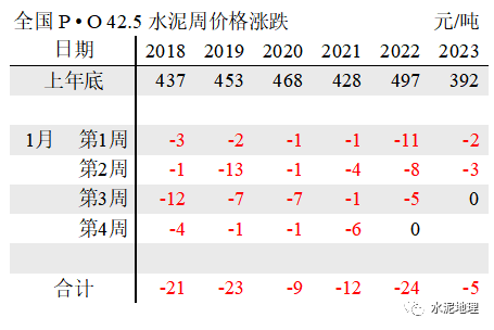 2022年年初水泥价格承接上年价格低位进入,1月春节,合计下跌5元/吨,较其他年度下跌幅度低。