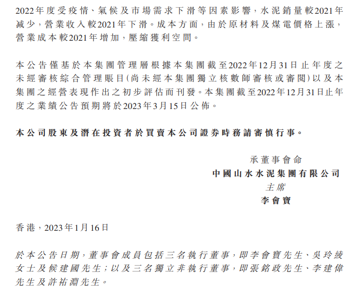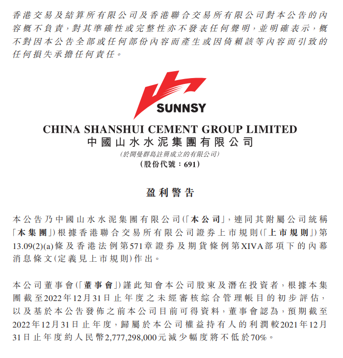 山水水泥:2022年净利润预计同比减少幅度将不低于70%