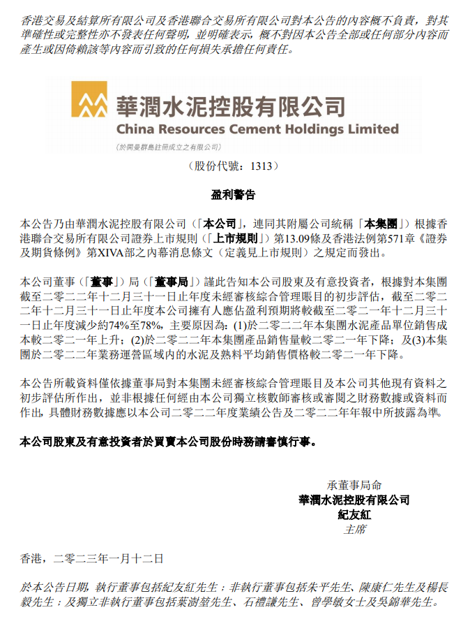 华润水泥控股1月12日在港交所公告,根据对集团未经审核综合管理账目的初步评估,2022年公司拥有人应占盈利预期将同比减少约74%至78%。