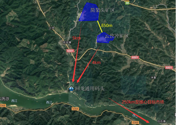 矿区距离西江回龙岸线约5千米,矿产品通过5千米皮带廊道直通码头,回龙岸线拟设4个3000吨级码头泊位(5000吨级码头水工结构)。砂石骨料可通过西江水运销往粤港澳大湾区,水路交通便利、区位优势明显、市场前景广阔。