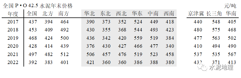 2022年,一是水泥价格大幅下降,二是全区域下降。北南方下降幅度都在20%,华东、中南是价格领跌地区,幅度超过25%,华北、西南下跌幅度低于17%。