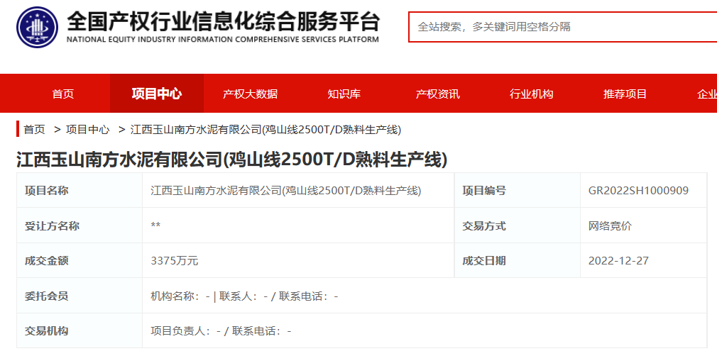 12月27日,全国产权行业信息化综合服务平台发布江西玉山南方水泥有限公司鸡山线2500t/d熟料生产线转让结果,成交金额为3375万元。