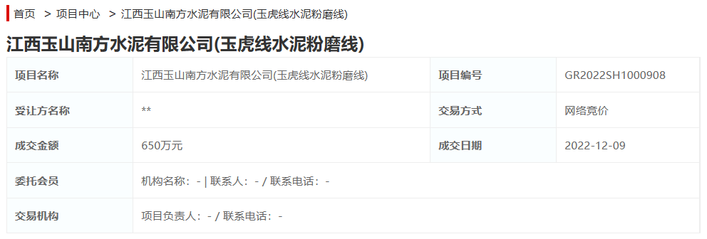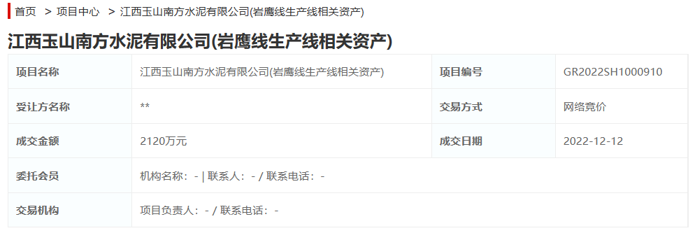 此前,江西玉山南方水泥有限公司岩鹰线生产线相关资产2120万元成功转让,江西玉山南方水泥有限公司玉虎线水泥粉磨线650万元成功转让。