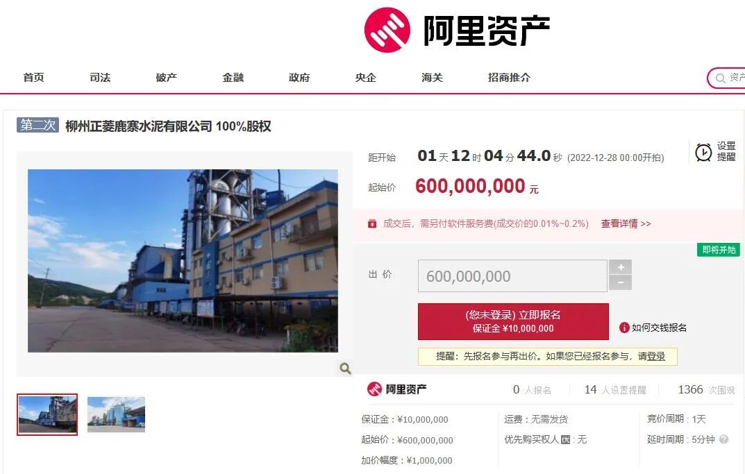 近日,阿里拍卖平台发布柳州正菱鹿寨水泥有限公司100%股权竞拍公告,起始价为6亿元。此次为该公司第二次竞拍转让股权。第一次竞拍标价为6.5亿,于12月11日10时结束,结果是竞价失败,无人出价。