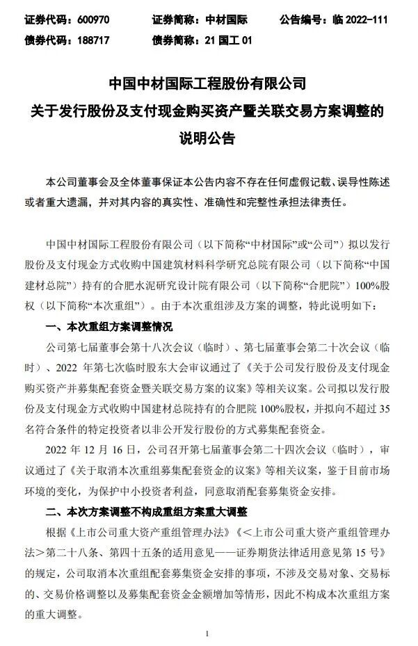12月20日,中材国际也发布公告,先前公告披露,公司拟以发行股份及支付现金方式收购中国建筑材料科学研究总院有限公司(“中国建材总院”)持有的合肥水泥研究设计院有限公司(“合肥院”)100%股权,并拟向不超过35名符合条件的特定投资者以非公开发行股份的方式募集配套资金(“本次重组”)。