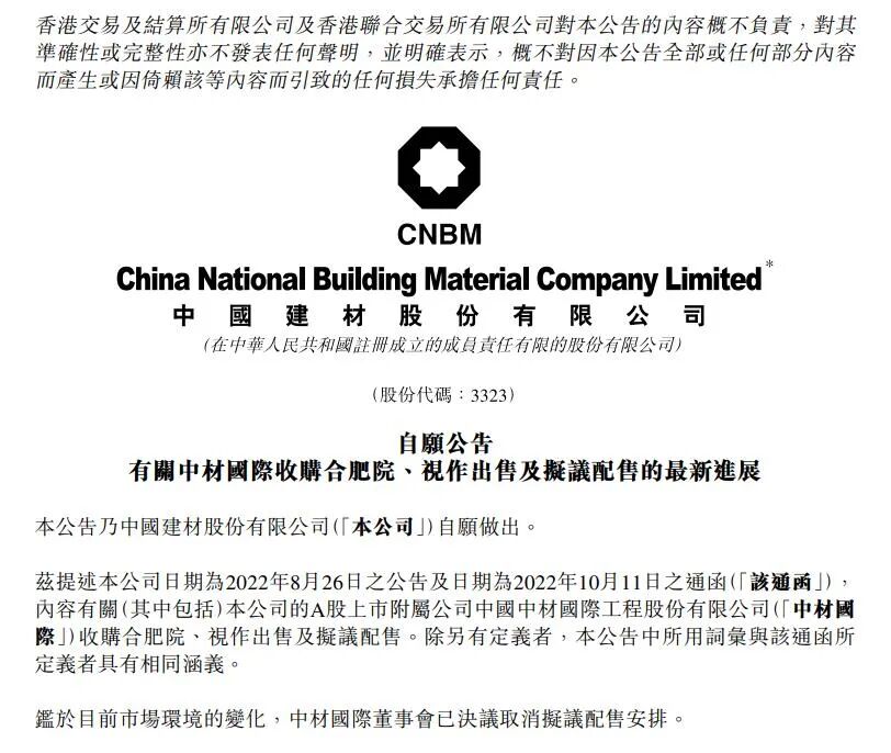 12月19日,中国建材发布公告,有关公司的A股上市附属公司中材国际收购合肥院的100%股权及于收购完成后进行新股配售以筹集资金用作支付收购的现金代价和中材国际的流动资金及债务偿还,鉴于目前市场环境的变化,中材国际董事会已决议取消拟议配售安排。