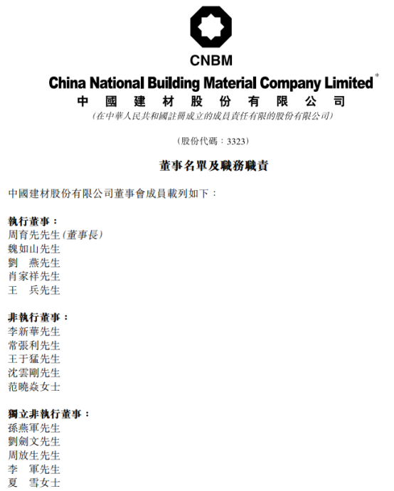 2022年12月19日,中国建材股份有限公司举行临时股东大会,正式任免并确定公司高层人员名单。