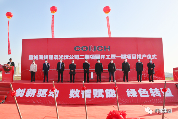 2022年12月15日,宣城海螺建筑光伏公司二期项目开工暨一期项目投产仪式在宣城举行。宣城市委书记孔晓宏,市委副书记、市长何淳宽,海螺集团党委书记、董事长杨军出席仪式。宣城市政府秘书长郑华、市委副秘书长李寿生、经开区党工委书记黎斌,海螺水泥总经理李群峰,海螺环保总经理李晓波,海螺新能源总经理马伟,股东代表褚衍玲、徐晓华,以及宣城市直有关单位和经开区负责人、行业嘉宾、施工单位代表参加了仪式。