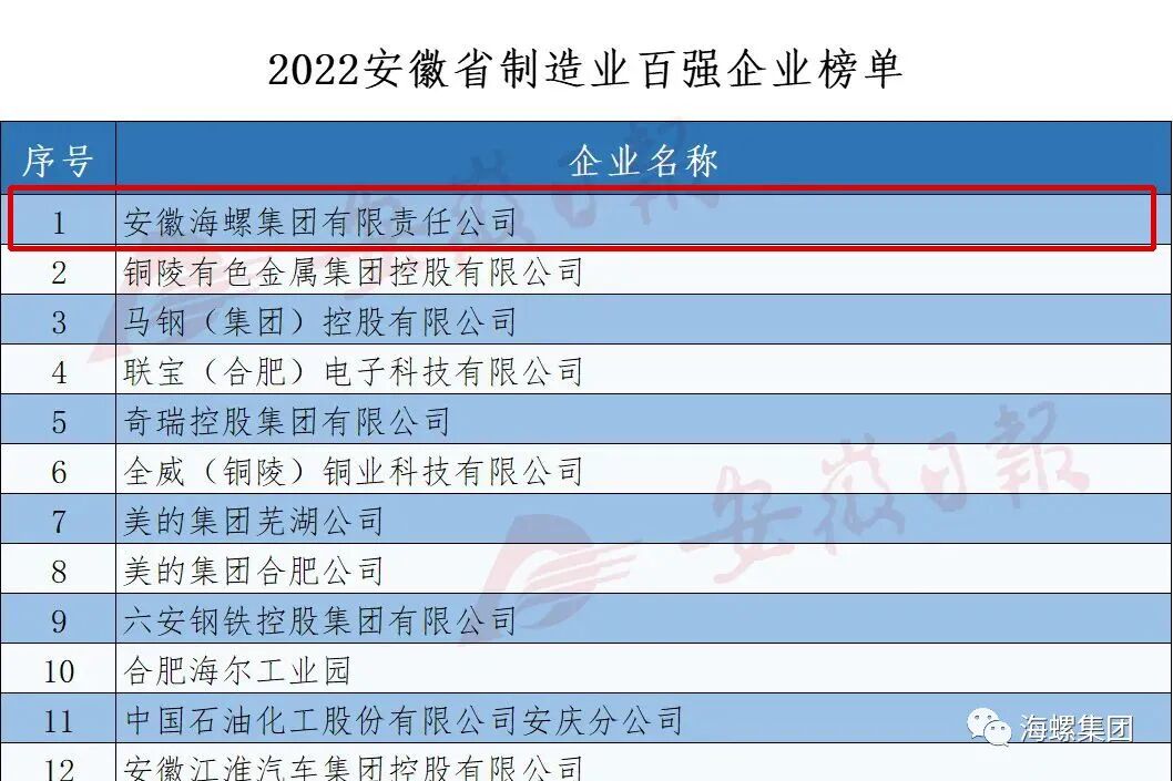 刚刚,安徽省企业联合会、省企业家联合会连续第18次发布“2022安徽百强企业”、“2022安徽制造业百强企业”、“2022安徽服务业百强企业”榜单。海螺集团名列“2022安徽百强企业”、“2022安徽制造业百强企业”两项第一。