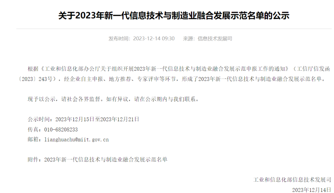 12月14日,工信部官网发布《关于2023年新一代信息技术与制造业融合发展示范名单的公示》称,据《工业和信息化部办公厅关于组织开展2023年新一代信息技术与制造业融合发展示范申报工作的通知》(工信厅信发函〔2023〕243号),经企业自主申报、地方推荐、专家评审等环节,形成了2023年新一代信息技术与制造业融合发展示范名单。现予以公示,请社会各界监督。