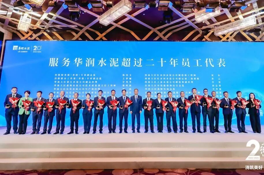 王祥明董事长为服务华润水泥二十年的员工代表一一颁发纪念奖章,并同他们亲切握手,向这些为华润事业、华润水泥事业奉献了美好年华和深厚热爱的员工致以肯定,对他们用奋斗点燃希望、用拼搏编织梦想、为水泥20年创业兴业注入强劲动力的坚守予以赞扬。