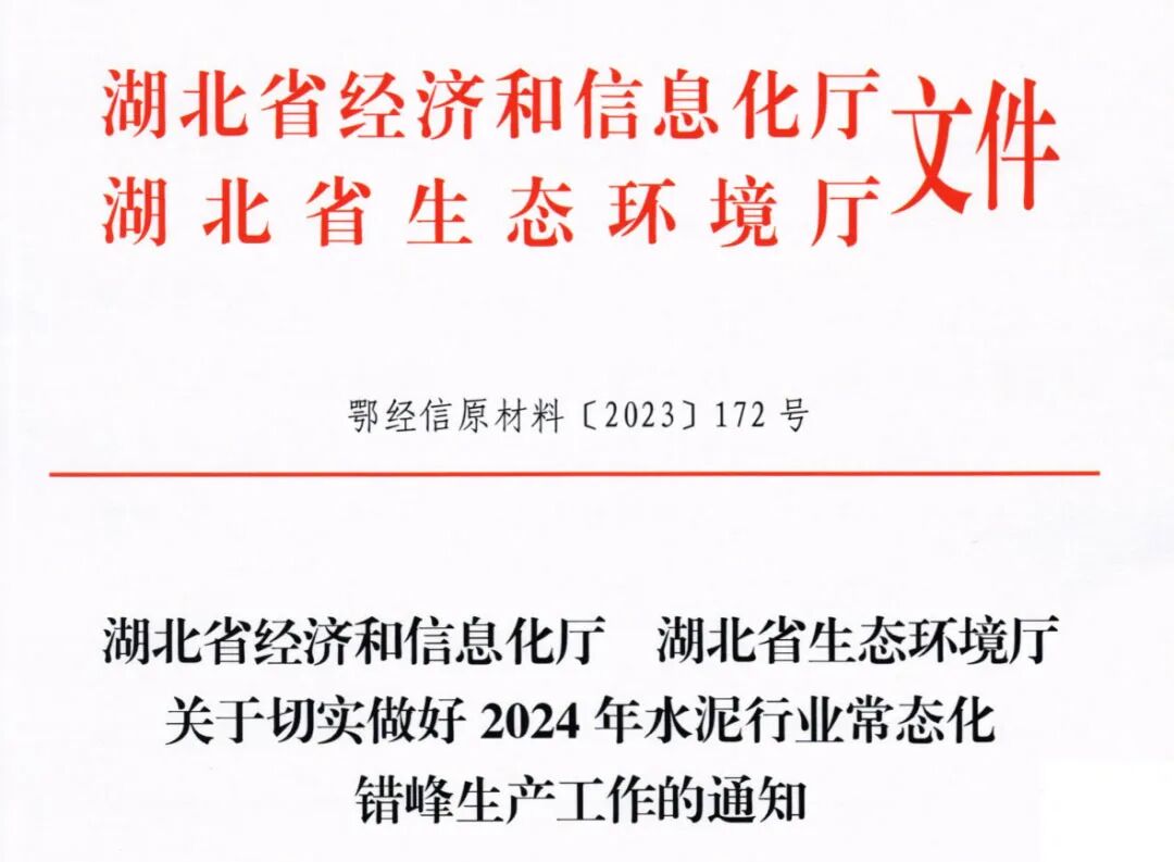 日前,湖北省经济和信息化厅、湖北省生态环境厅联合下发了《关于切实做好2024年水泥行业常态化错峰生产工作的通知》(鄂经信原材料〔2023〕172号)。