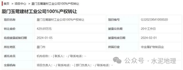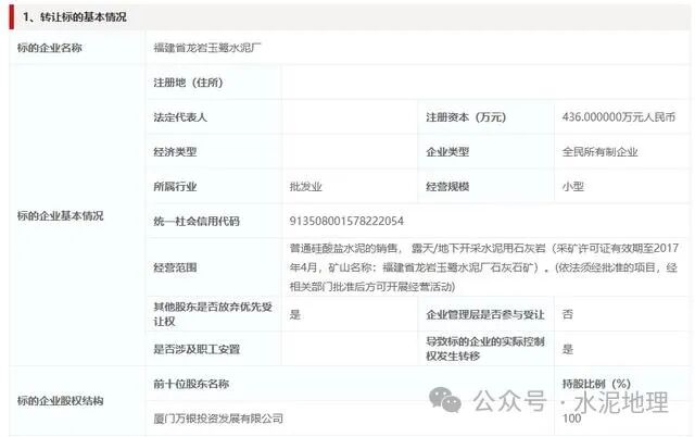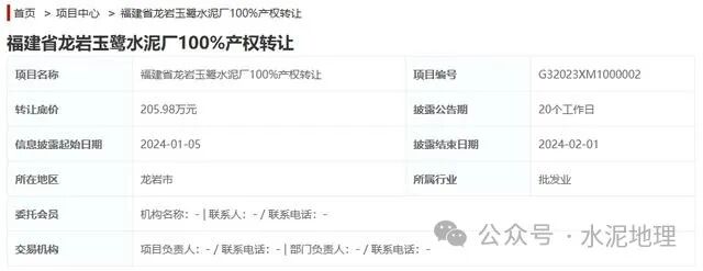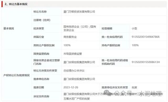 近日,相关信息显示,厦门万银投资发展有限公司转让福建省龙岩玉鹭水泥厂100%产权和厦门玉鹭建材工业公司100%产权,转让底价分别为205.98万元和429.69万元。