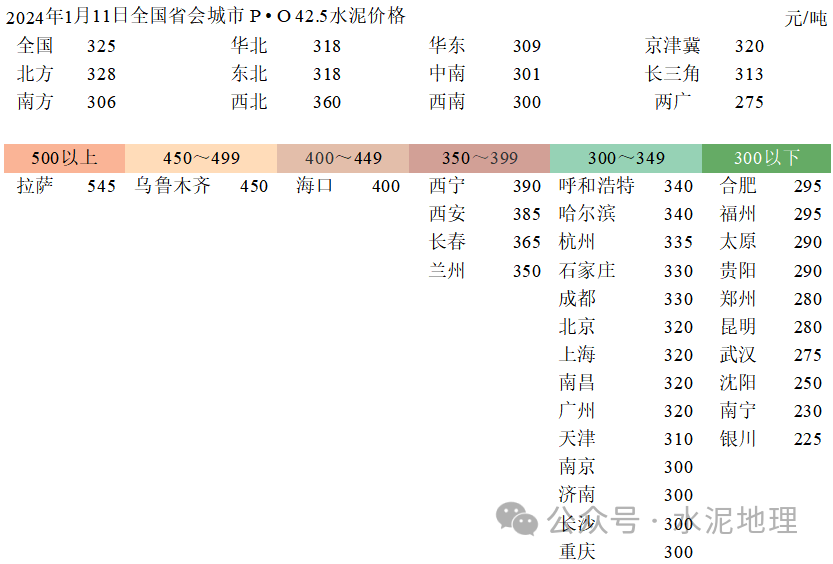 1月11日,全国P • O 42.5 水泥价格325元/吨。