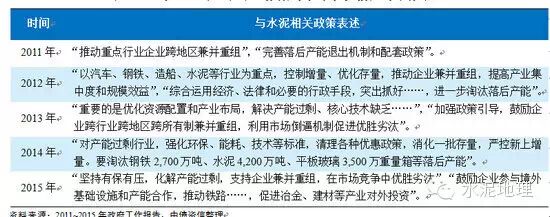 2015年3月5日,李克强总理在第十二届全国人民代表大会第三次会议上向与会代表做《2015年政府工作报告》,报告中提到“加快实施走出去战略。鼓励企业参与境外基础设施建设和产能合作,……,促进冶金、建材等产业对外投资。”梳理近年“两会”政府工作报告提及的与水泥相关的政策表述,我们发现对于水泥等相关过剩产能的调控政策,近年来已经发生微幅变动,从前期的单纯强调推动行业兼并重组、淘汰落后产能到现在增加鼓励企业参与境外产能合作、推动产业对外投资,中央已经将对水泥等过剩产能的调控置于全球化背景下的中国资源全球配置的战略高度。